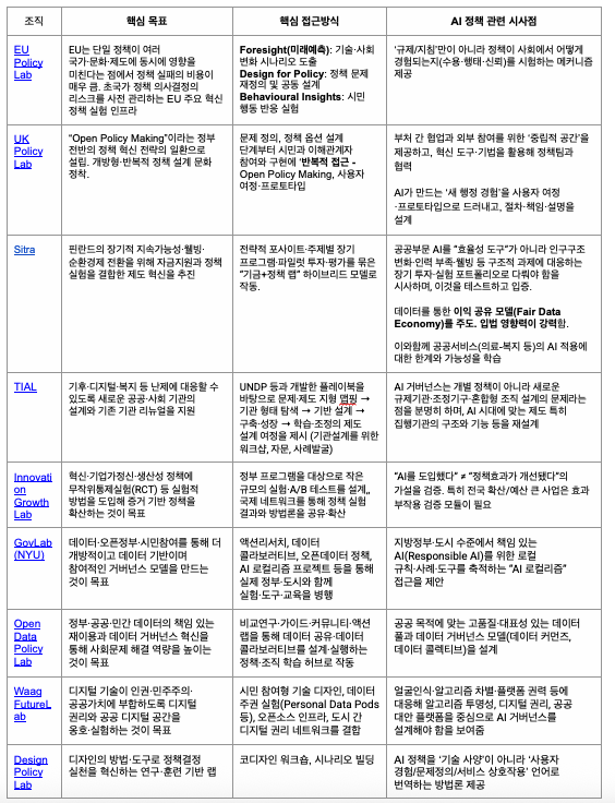 한국에서도 정책 혁신을 위한 정책 랩 시도 자체는 존재해 왔다. 행정혁신, 디자인 기반 정책 설계, 시민 참여형 정책 실험 등은 과거 여러 연구기관과 정부 조직을 중심으로 제한적으로 시도된 바 있다. 그러나 이러한 시도는 대부분 개별 정책 영역이나 일반 행정 혁신에 국한되었으며, AI 정책과 같이 고위험·고불확실성을 지닌 영역에는 본격적으로 적용되지 못했다는 한계를 가진다.